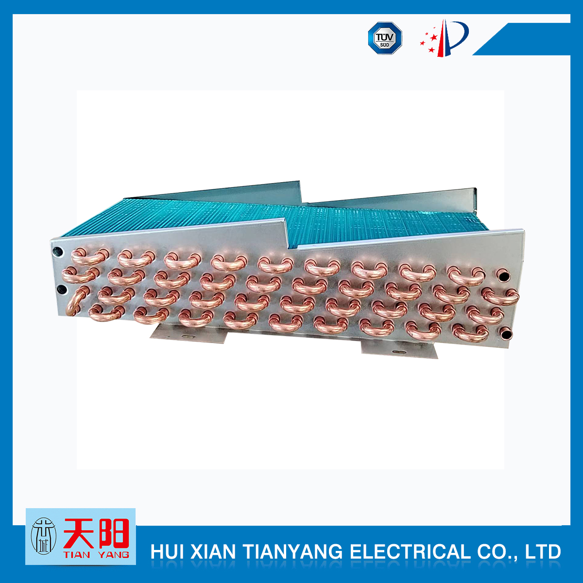 輝縣天陽電器有限責任公司位于肥沃的中原河南省輝縣市學院路中段工業集聚區興業園3號廠房,以制冷設備用冷凝器,蒸發器,熱交換器為主。主要材料為銅管鋁翅片,銅管銅翅片,鋁管鋁翅片。廣泛應用于冰箱冰柜,制冷設備,暖通設備,空調,自動售貨機,冷干機,超市立風柜,冷藏車,烘干機等產品領域。  公司自1998年成立以來,始終堅持:“科技造就產業、質量成就信譽、誠信鑄就輝煌”的質量方針,從產品拓展上堅持“人無我有,人有我優,人優我特的”經營理念,25年來,從1998年開始供應河南冰熊集團下屬的冷柜廠,制冰機廠各種冷凝器;2003年之后,原冰熊集團的精英志士開始在全國各地發展,所到之處依托我公司供貨,以致于多家目前已具行業中佼佼者的公司,從而建立了如凱雪公司,兆邦公司、凌云公司、海寶公司、正雪公司、上海忠云、山東德萊維等幾十余家公司在草創時期的啟蒙供貨商,友好共贏長達十余年,成為我國制冷行業的供應商。以致在2015年初雙匯集團面向社會的招標書中指名要我公司冷凝器、蒸發器指定產品供應商